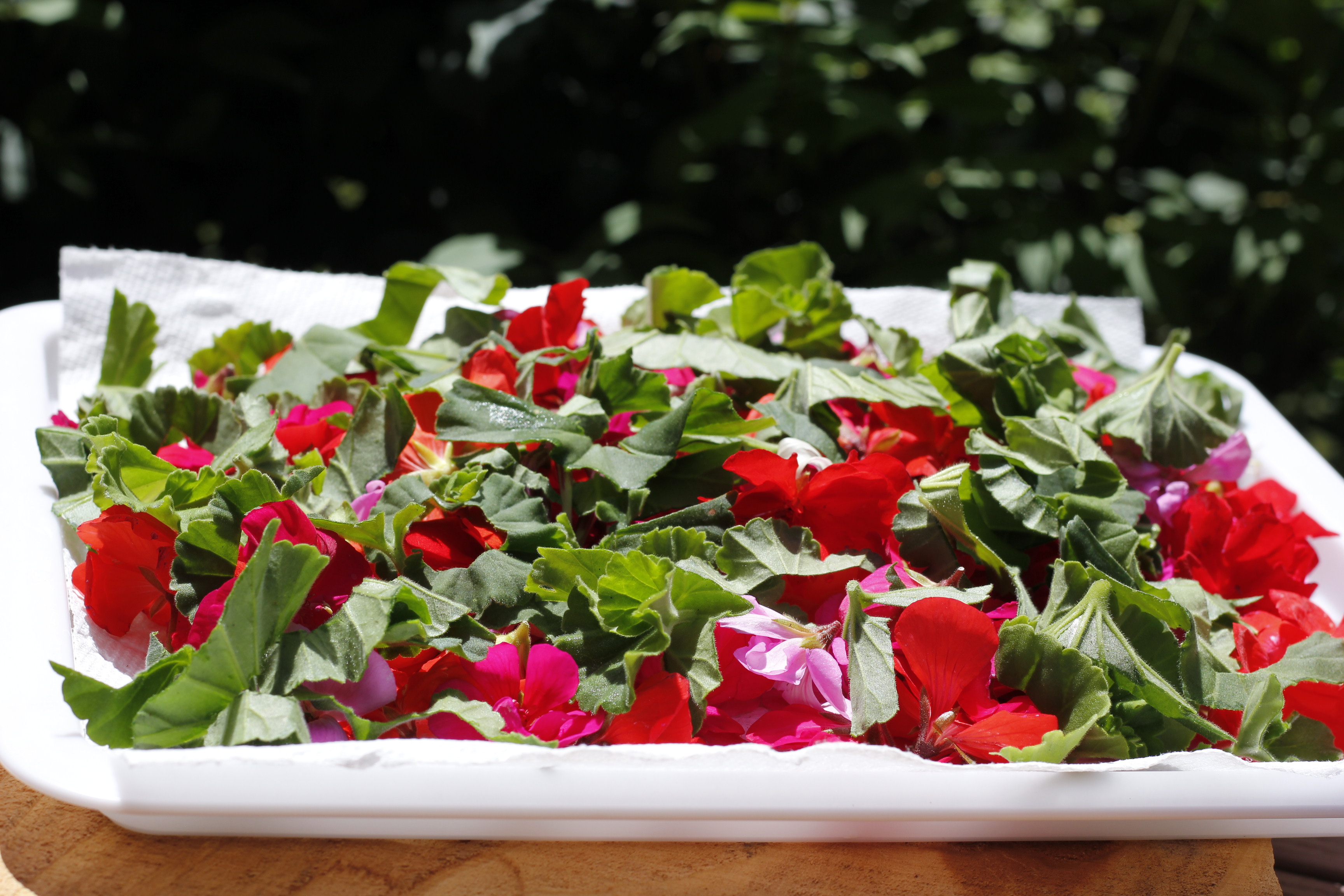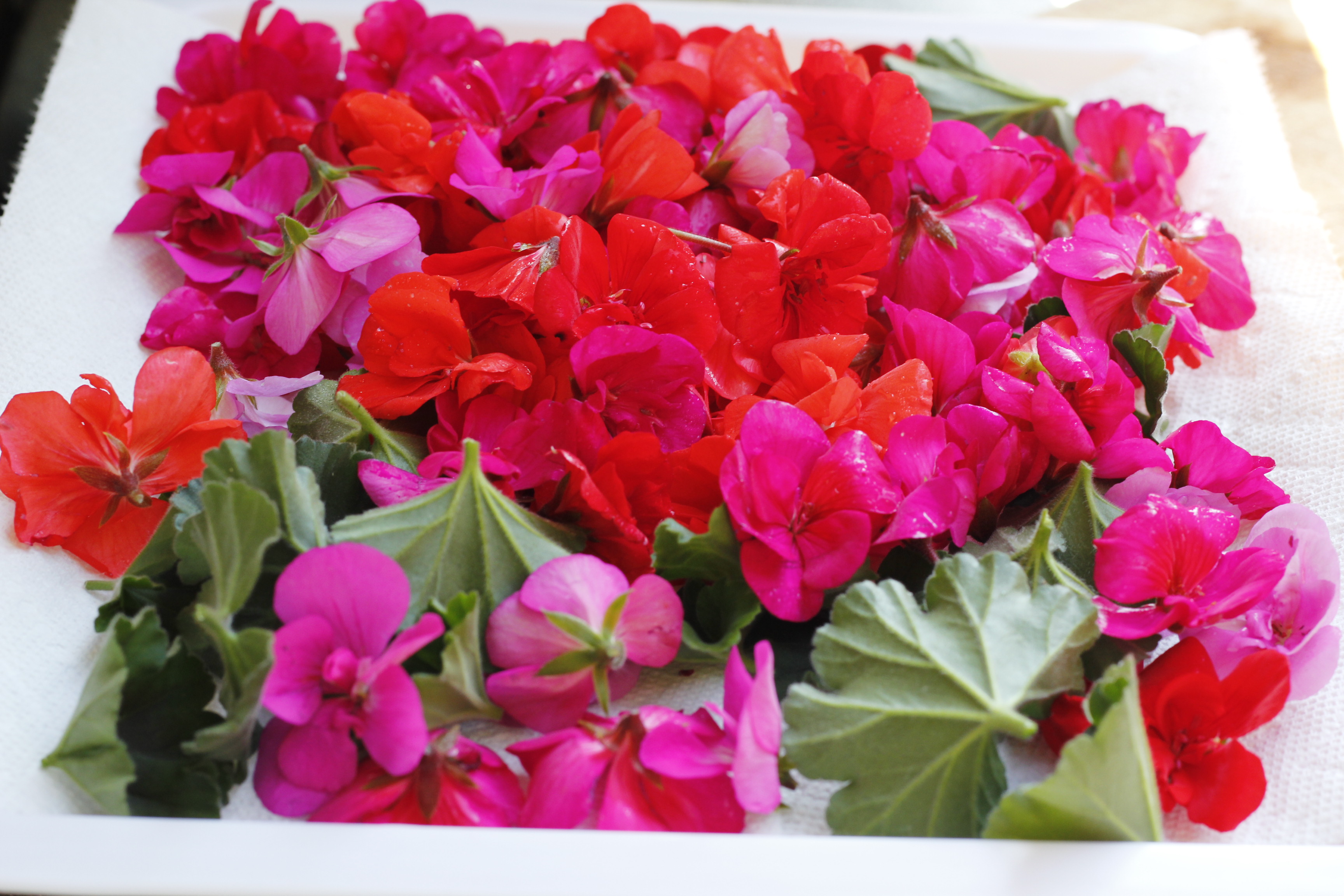제라늄을 정원의 식용꽃터에 심자마자, 수확하여 사용하기 위한 연구에 들어갔는데,